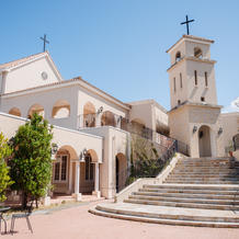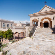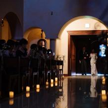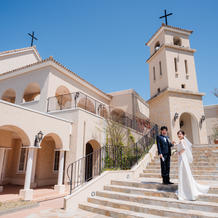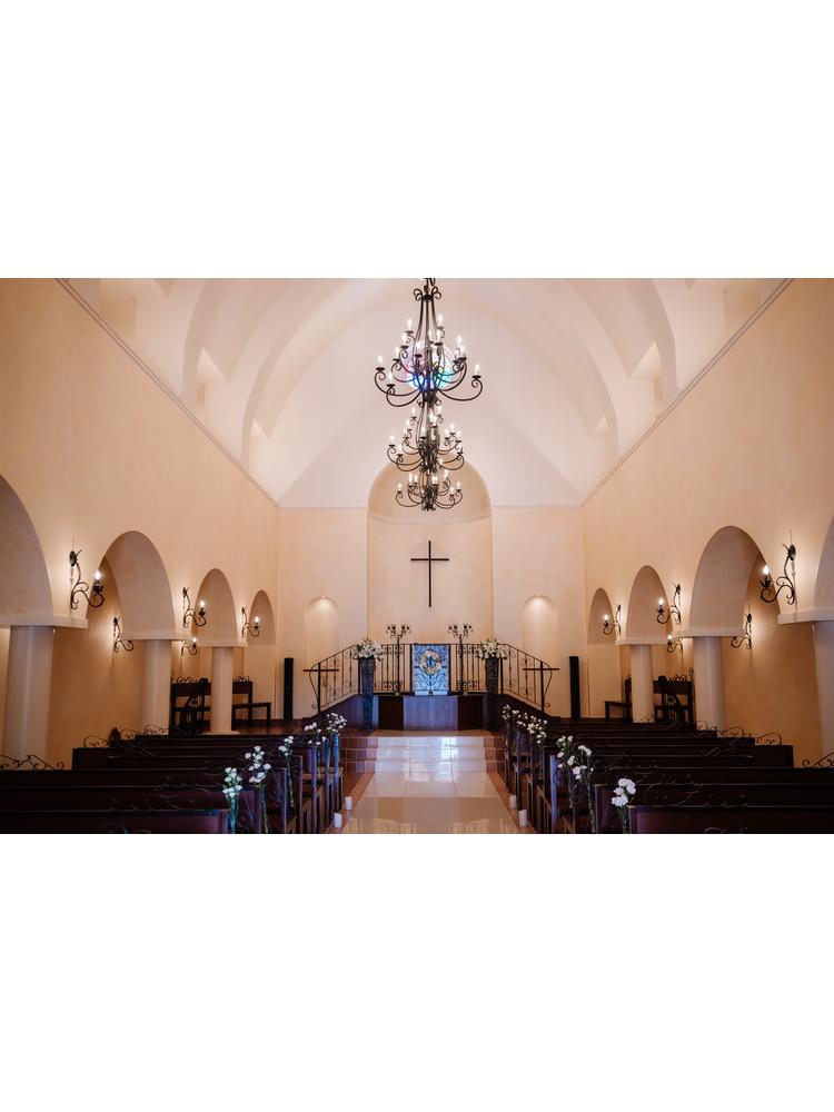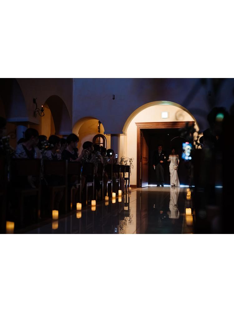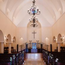 挙式会場は天井が高く、日差しが当たってステンドグラスが綺麗に輝いていました。床は2人の姿を反射して映し出すくらいとても綺麗でした。挙式会場横にラコンテという控室があり、挙式が始まるまで花嫁の父母と最後の語らいができます。