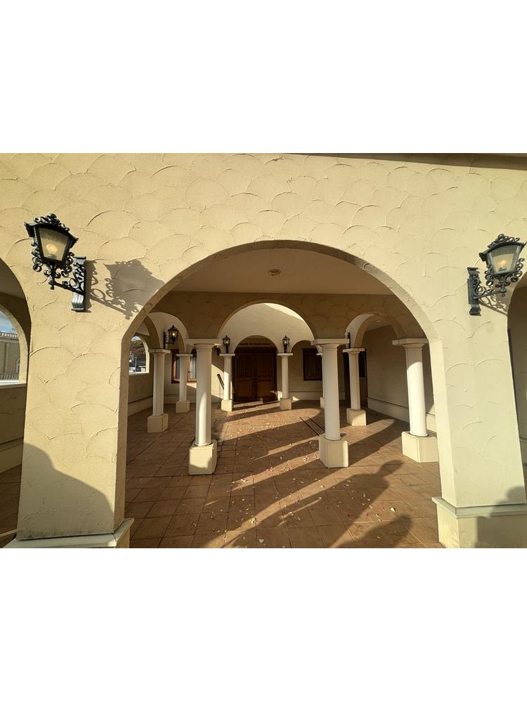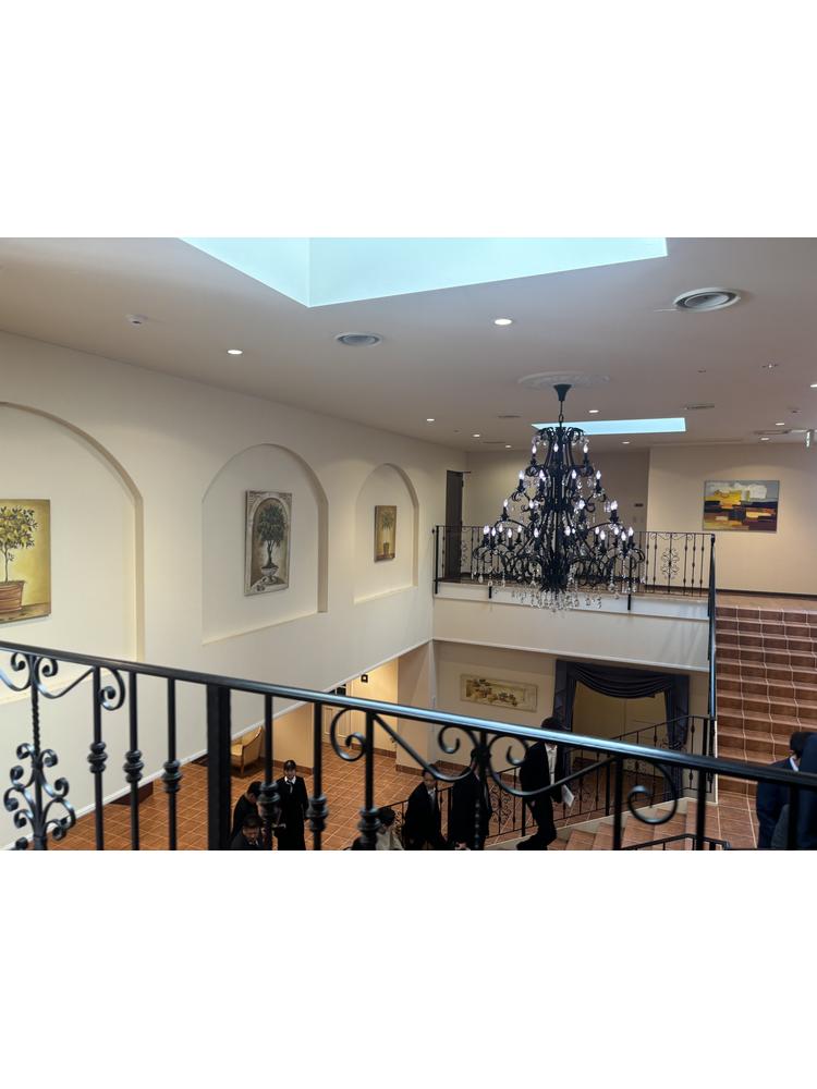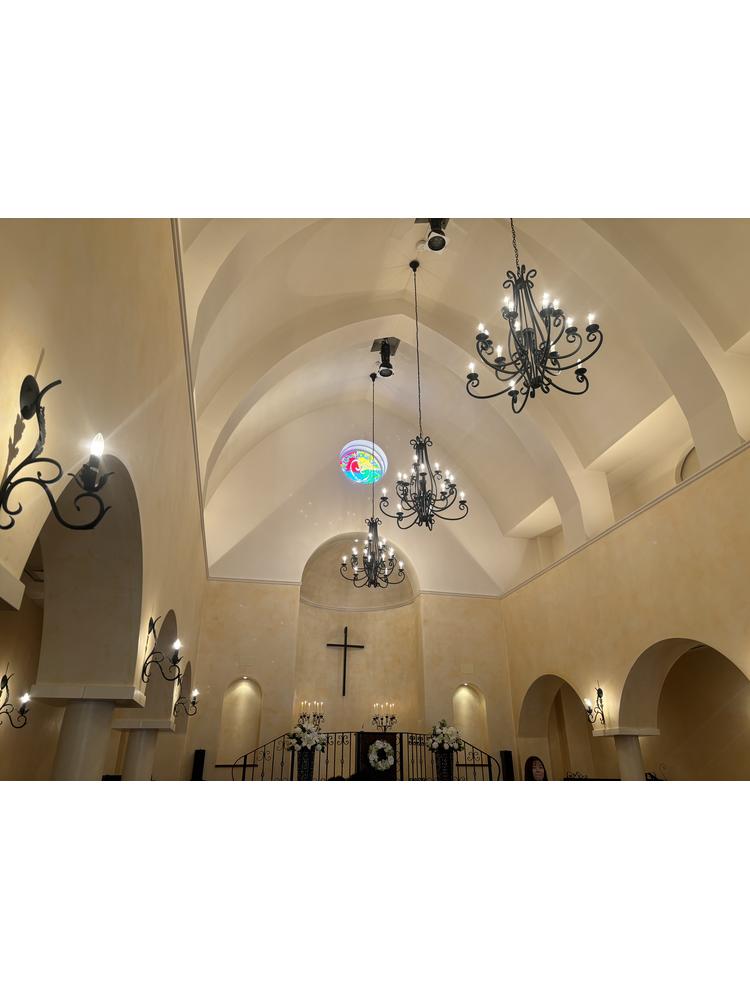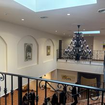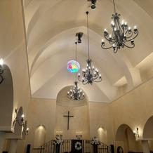 挙式会場は一般的な教会でありながら白を基調としたカジュアルさもありながらラグジュアリーな印象。シャンデリアもあるが主張が激しくなく落ち着いた雰囲気。窓にあるステンドグラスからは自然光が入り、綺麗な雰囲気。