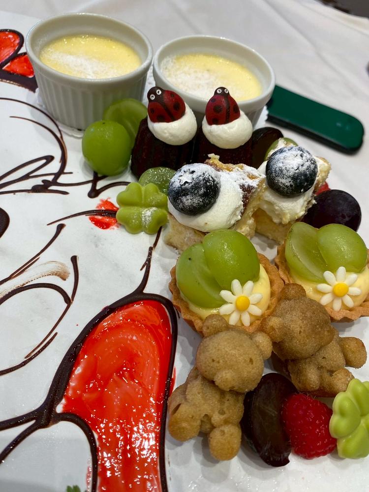 お肉が柔らかくて美味しかったです。デザートビュッフェのお皿のキャラクターの絵が上手でびっくりしました。
