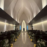 本格的な教会の造りがとても印象的でした。高い天井とステンドグラスから差し込む光が美しく、厳かな雰囲気の中に温かさも感じました。披露宴会場はクラシカルながらも上品で、装花や照明の演出も洗練されています。