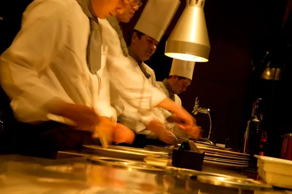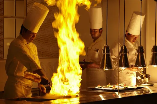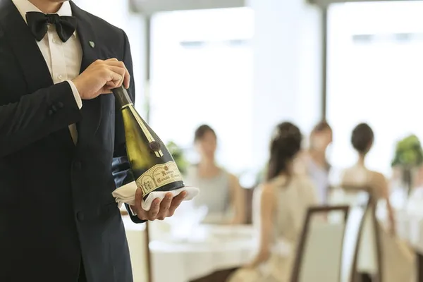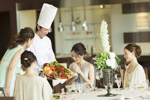 会場にはオープンキッチンを設け、サービススタッフが出来立ての料理をご提供いたします。ゲストも驚く料理パフォーマンスもあり、おふたりとゲストへの最高のサービスで感動を超えたおもてなしを。