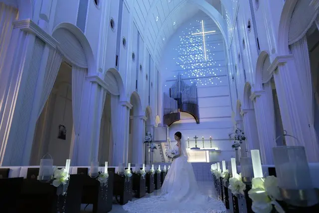 静寂の中、無数のステンドグラスが煌めく大聖堂…心震える感動の挙式を