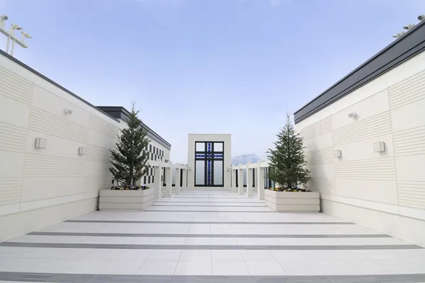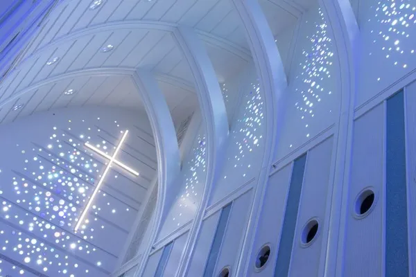 大空に映える大聖堂は、高さ20m。「フランダースの犬」で有名な、ベルギー・アントワープのノートルダム大聖堂から、特別な祝福を受けた教会です。スタイリッシュなデザインでありながら荘厳さを漂わせる佇まいは、観る人の心を奪う美しさです。
