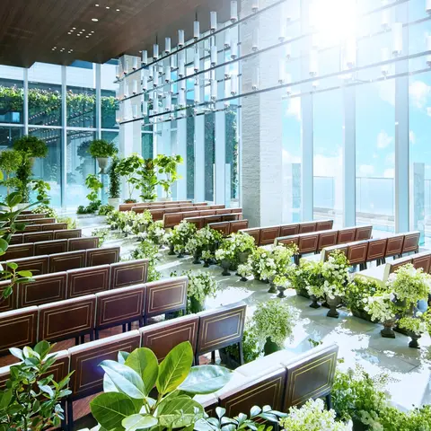 梅田エリア10駅から徒歩圏内の好立地。自然光差し込むガラスのチャペルや森のようなナチュラルテイストが揃う2つのフロアを貸切って素敵な一日を!