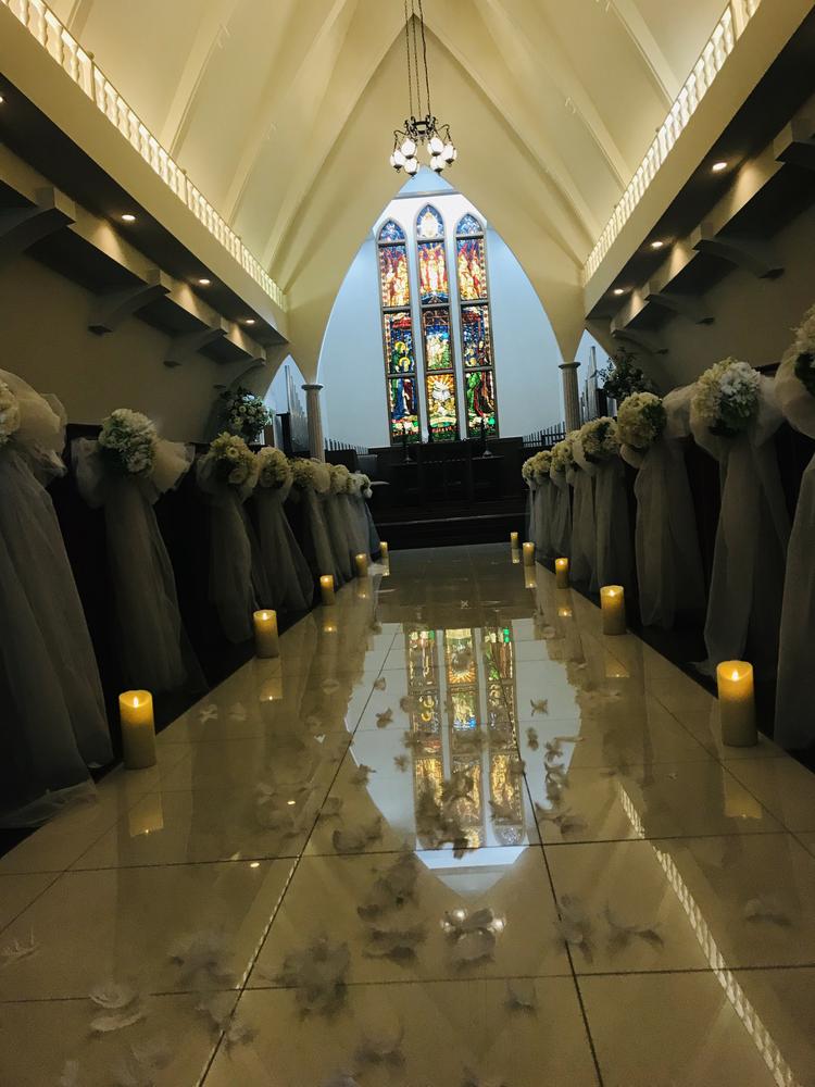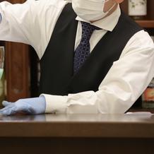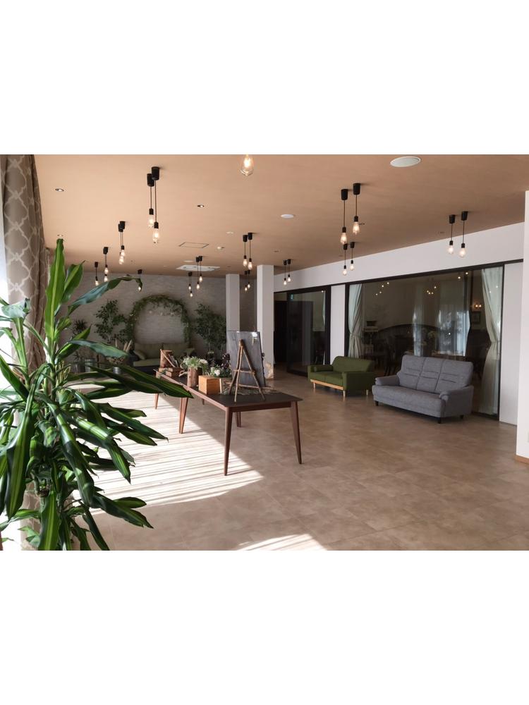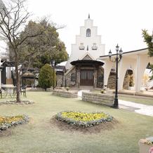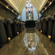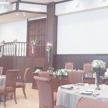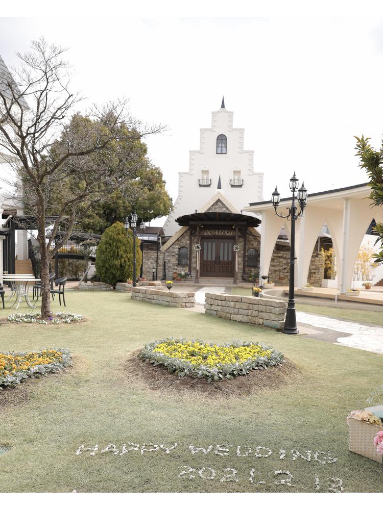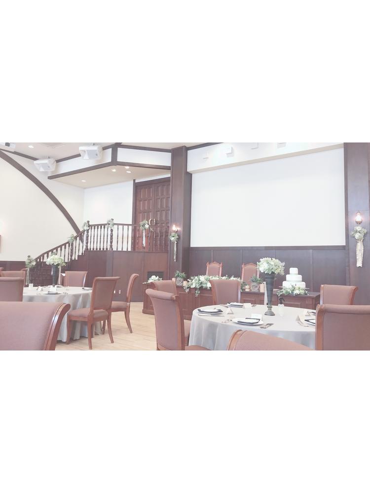 式場は独立型で中庭の中に立っています。イギリス田舎町をモチーフにした式場とのこともあり、可愛らしい感じの式場です。そこまで大きくはなく、まるで森の中にひっそりある童話に出てきそうな感じです。中は広く正面にあるステンドグラスはとても素敵でした。また、演出で天使の羽をふらせるエンジェルシャワーやシルクロード等式場内でもゲストに驚きを与えることができます。披露宴会場は2つあり、私たちはキャッスルクームという木の温かみを感じることができる会場で行いました。40名ほどのゲストでしたので、非常に広く間隔を取ることができ今のご時世には安心でした。また、ガラス張りの部屋があり、高齢なゲストをコロナ対策で隔離することができたのでよかったと思います。
