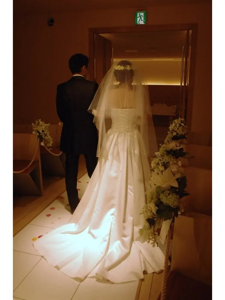 事前に一度、表参道店にドレス選びに伺いました。ドレスの写真が入ったアルバムから気になるドレスをバーッと選び、それが空いているかどうかを確認していただくのですが、可愛いなと思うドレスは全て空きがないか、オプションで+50000円等のものでした。もっと早くにドレス選びに行かなければならなかったんだなぁとその時初めて気が付きました。結局シンプルで無難なものを選んだのですが、当日、式の合間に家族からパニエがドレスに響いていると指摘されましたが、もうどうにもならずでした。ホテルのカメラマンさんに撮っていただいた写真を見ても、家族に撮ってもらった写真を見てもほとんどにパニエの線が写ってしまってたのが今回の唯一残念なことでした。