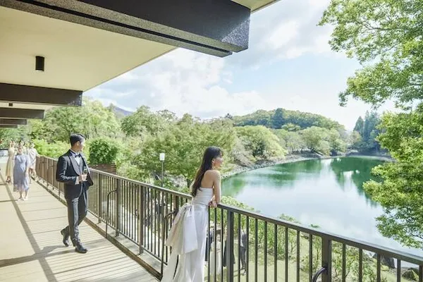 四季の色づきが美しい雄大な自然に囲まれたガーデン。特別な一日をお過ごしいただくのは、奈良の雄大な自然に囲まれた贅沢な空間。モダンな雰囲気が漂うパーティ会場には専用のテラスやガーデンを完備しており、思い思いのひと時をお楽しみいただけます