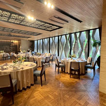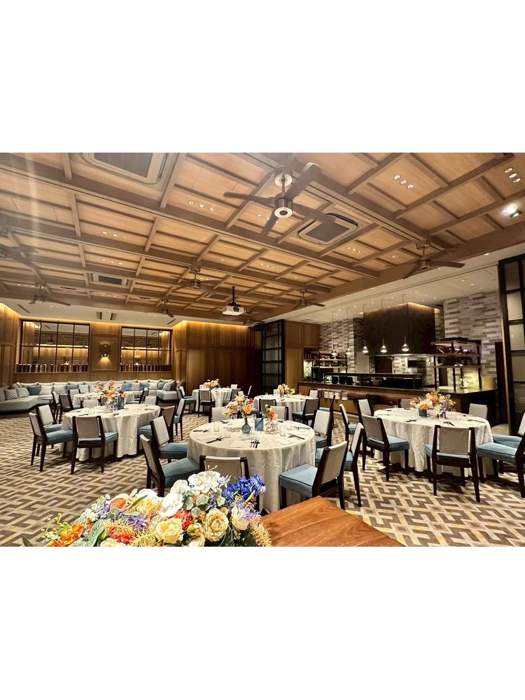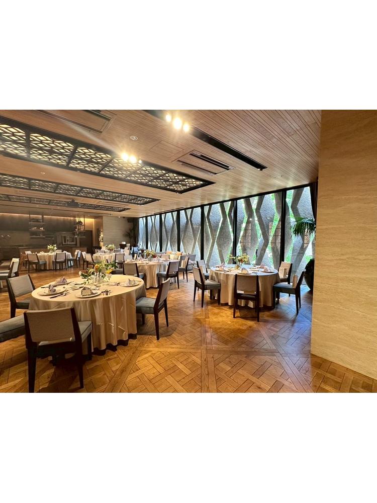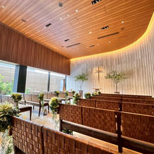都会の中の緑豊かな歩道に佇む式場で、入ると右手にあるバーカウンターに心が躍りました。ウェルカムアミューズなど普段レストランとして営業していることもあり大変親しみやすい雰囲気でした。2階に上がると雰囲気が打って変わって神聖なチャペルに。青や黄色など壁面に原色の装飾が施されているのでカジュアルな印象を受けますが、音が一面に響き全身が音で包まれる感覚に感激しました。