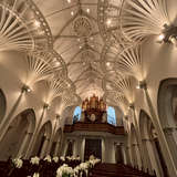 チャペルは神聖な雰囲気でよかった。チャペルの外は噴水があり緑豊かで、チャペルをバックに新郎新婦の写真を撮り素敵な1枚になった。挙式会場はレトロな雰囲気で螺旋階段があり、お色直し五に螺旋階段から登場していて素敵だった。