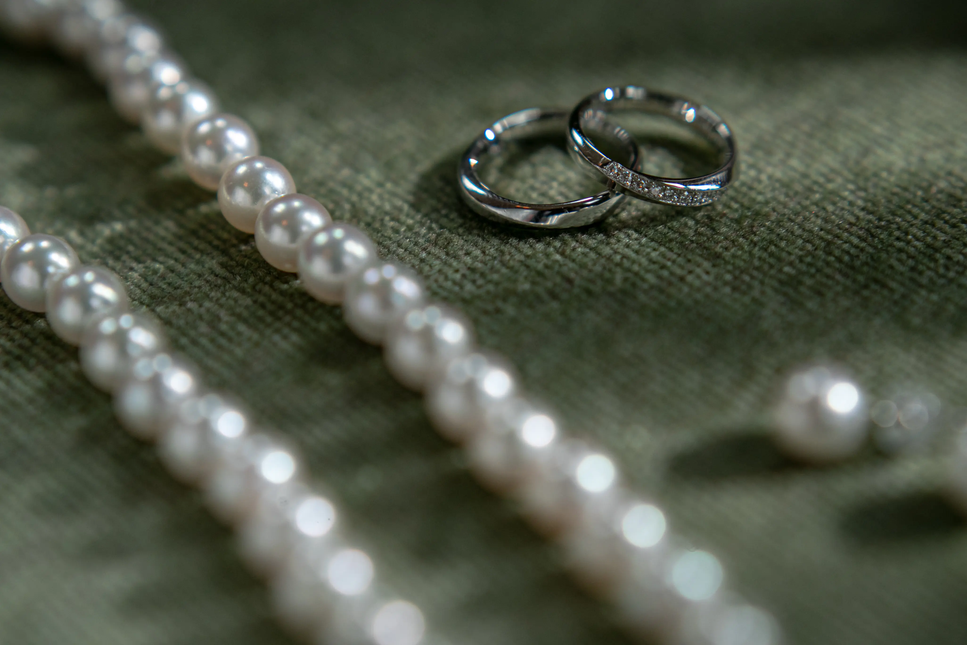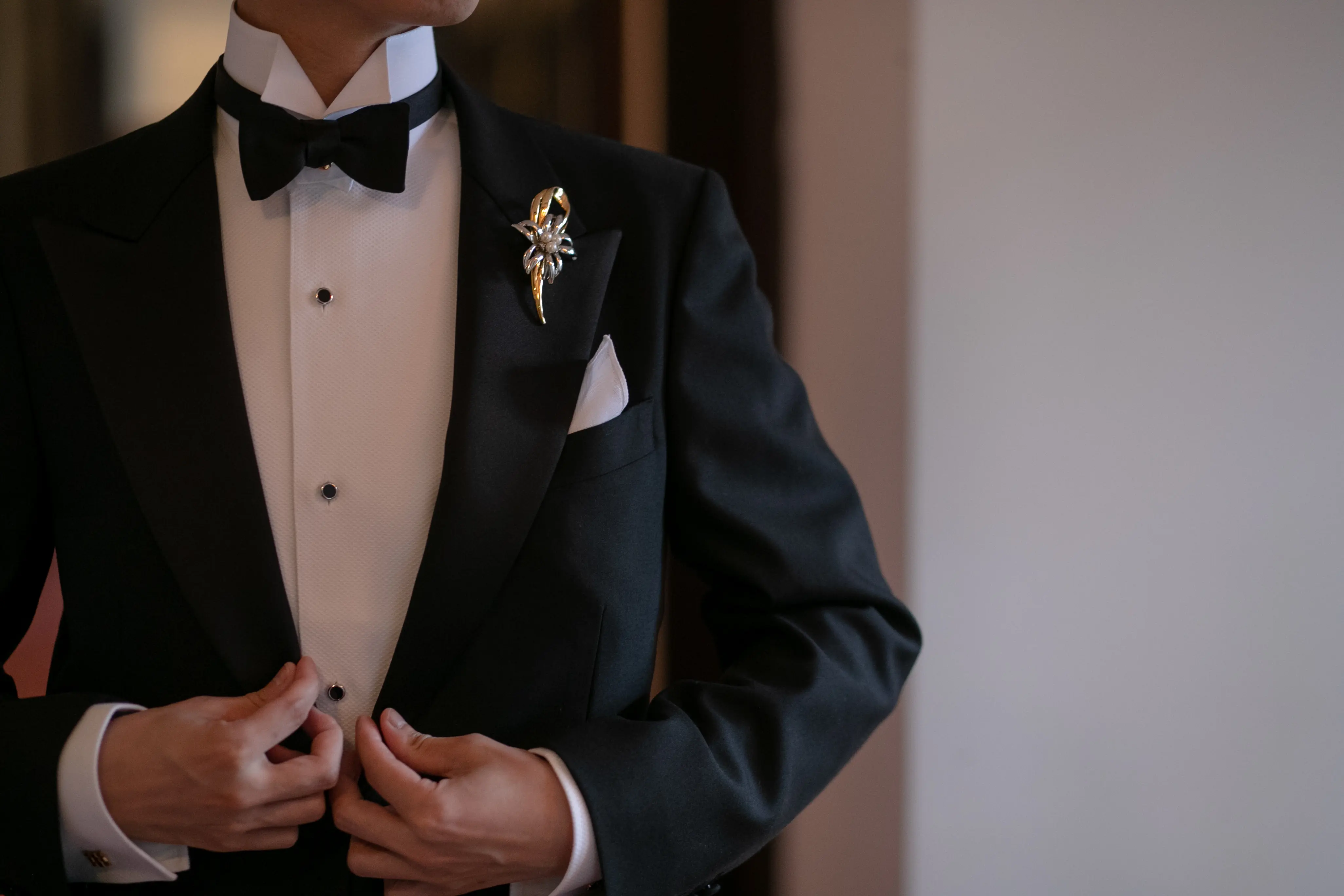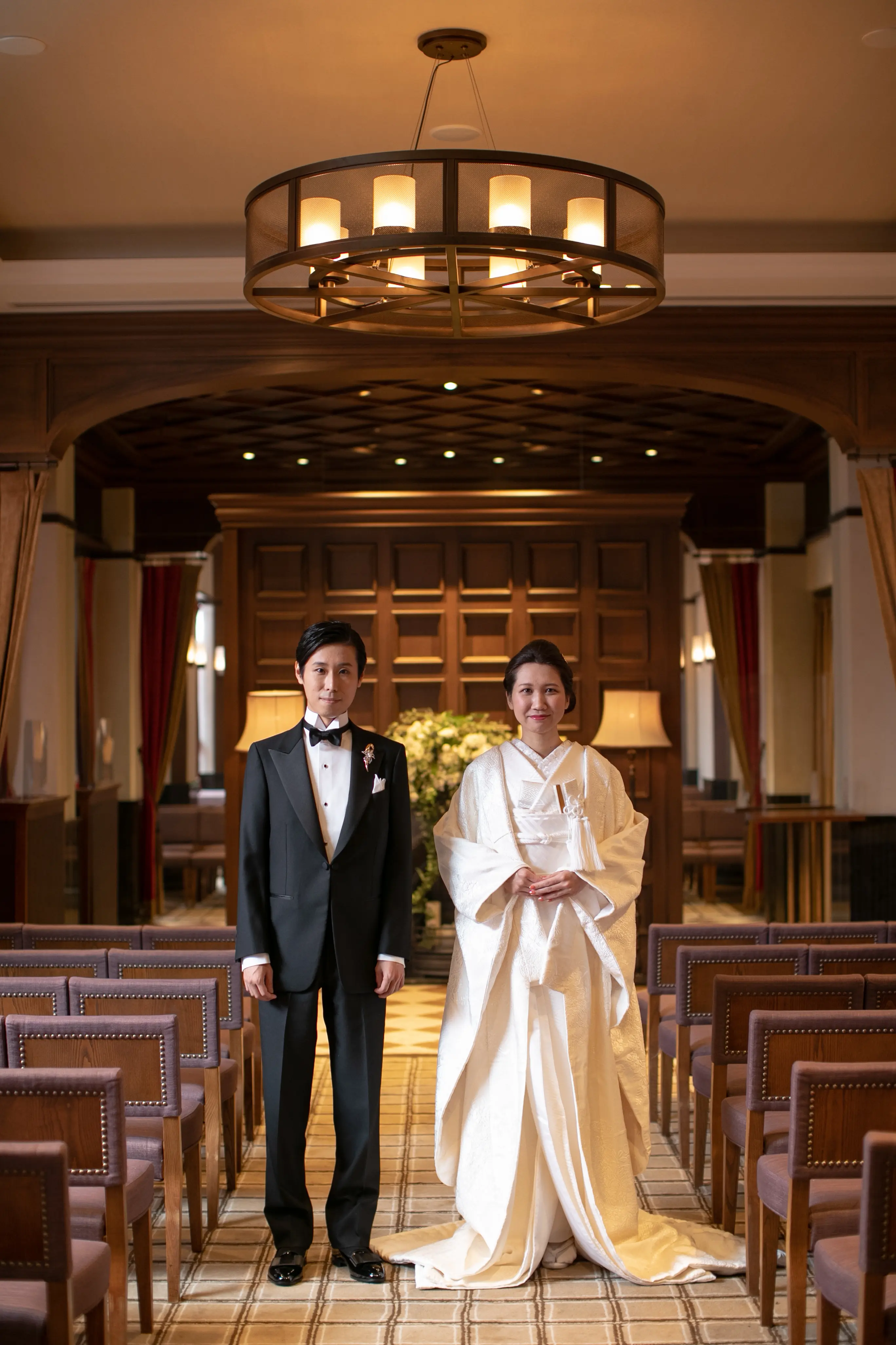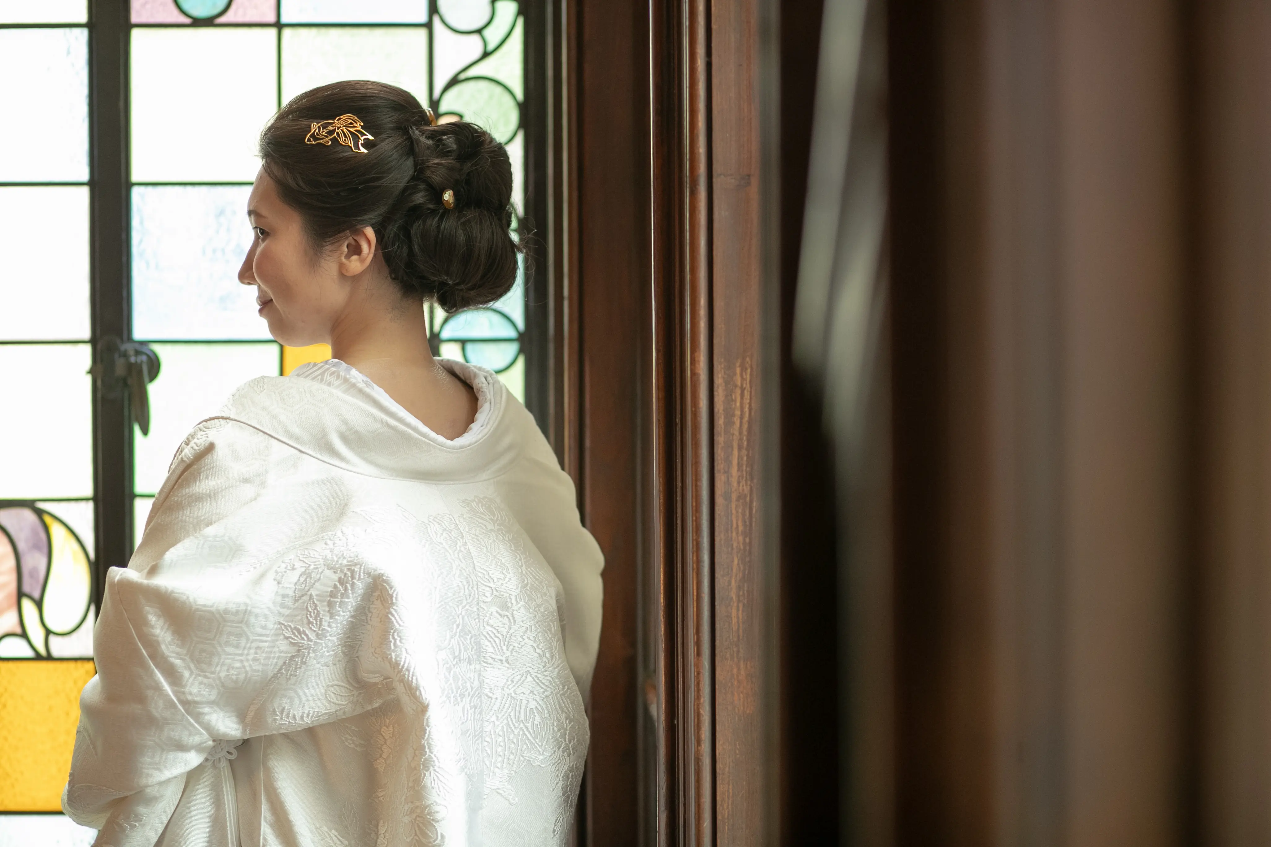 新郎のブローチ、新婦の櫛笄はともにアンティーク品です。
