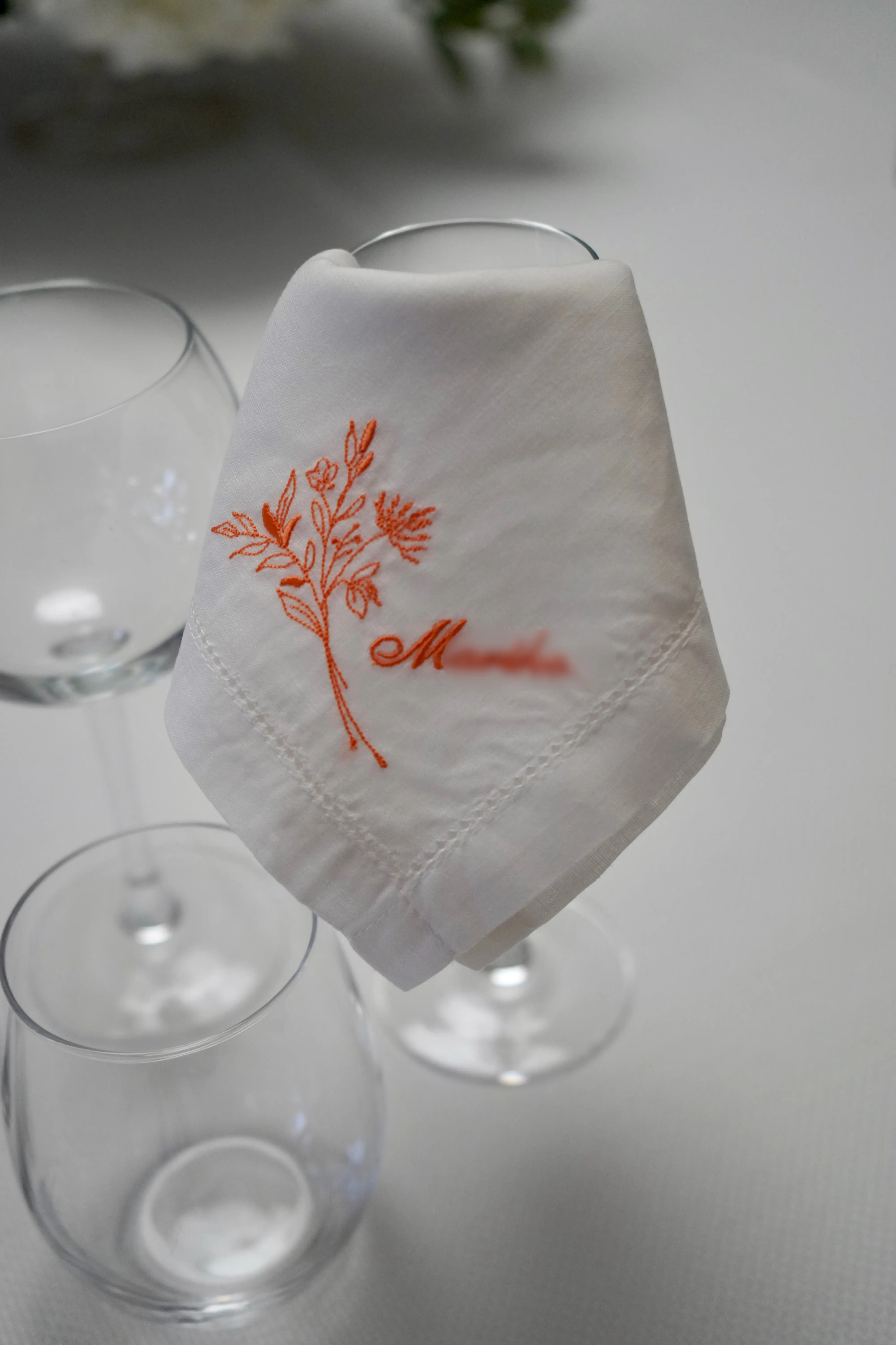 席札としてプレゼントされた夢遊布さんの刺繍入りハンカチ。Instagramで見つけて依頼されました。