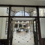 挙式会場は大きなステンドグラスが特徴的です。バージンロードが白いのでステンドグラスが映ってとてもキレイです。披露宴会場は全体的にくすみカラーなので落ち着いた雰囲気です。ガーデンと繋がっており、入場口を選べたり、演出に使うこともできます。