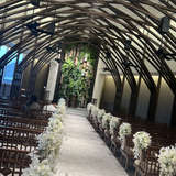 挙式会場は座席がたくさんあって大人数でも余裕です。木と緑が綺麗で装花も豪華です。シックで落ち着いてるけど都会的です。