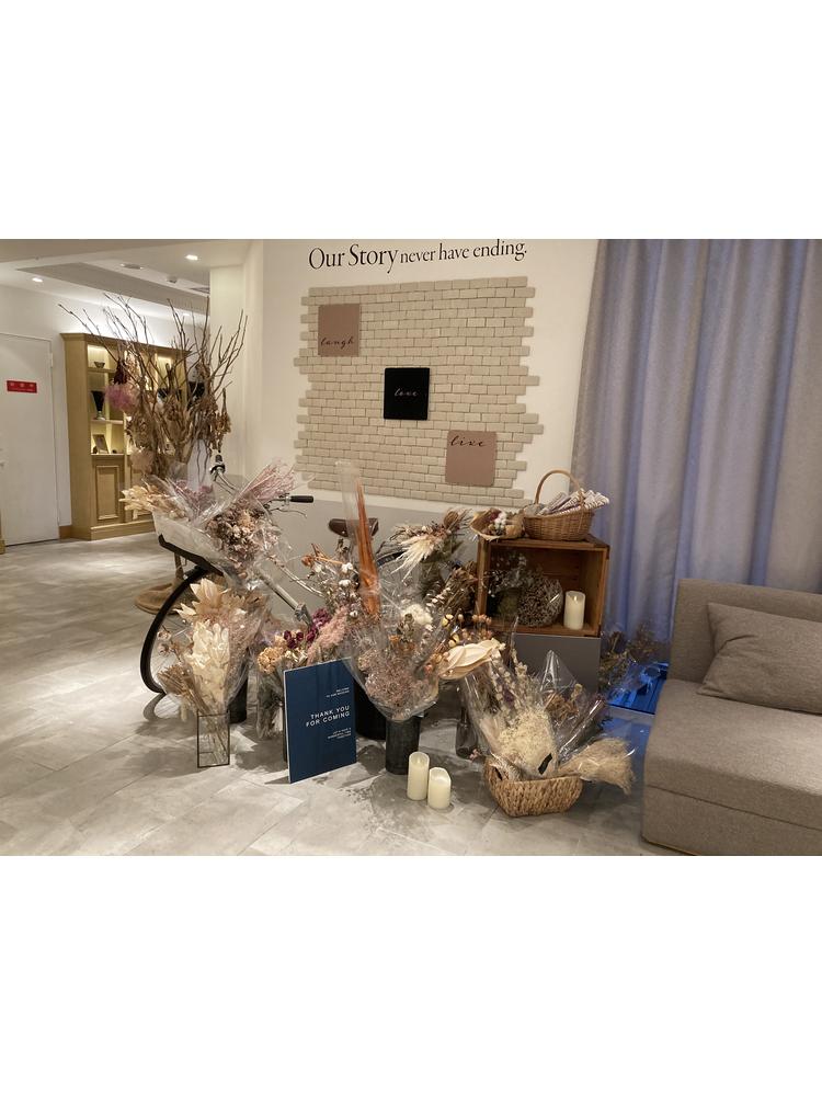 挙式会場は列席者がバージーロードの方を向いて座る形式で、アットホームな雰囲気でよかったです。披露宴会場はドライフラワーなどを基調とし、高砂もソファでおしゃれな雰囲気です。